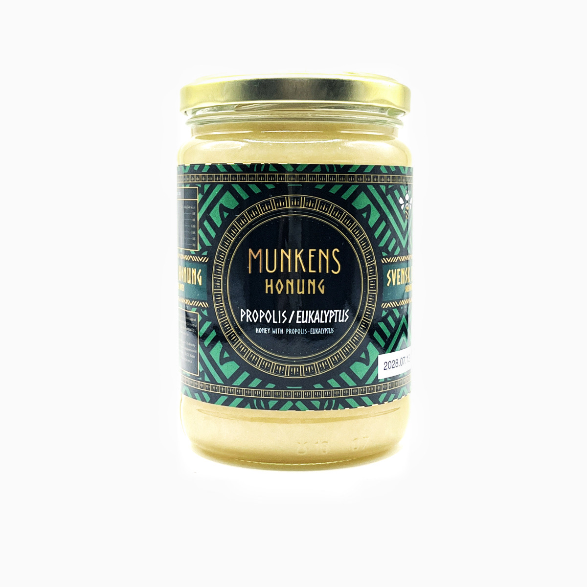 Svensk kallslungad honung (max +32) direkt tappad på burk. Smaksatt med ekologisk eukalyptus, pepparmintsolja, menthol samt svensk propolis. Förvaras i rumstemperatur (+18-22). Vattenhalt max 20%. Återvinns som glas (burk) och plåt (lock). Ej till barn under 1 år.